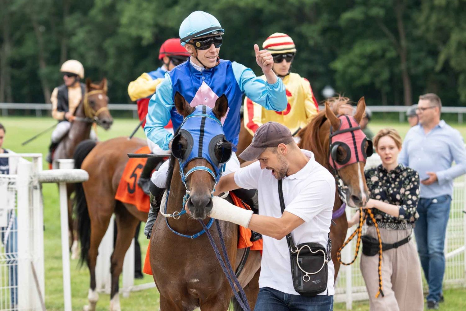 Podczas startu przewrócił się w boksie Rasi Al Kahlediah, zrzucając dżokeja Kamila Grzybowskiego, któremu na szczęście nic się nie stało. W niedzielę w ostatniej gonitwie odniósł on na folblutce Inwencji 300 zwycięstwo w karierze. Gratulujemy!